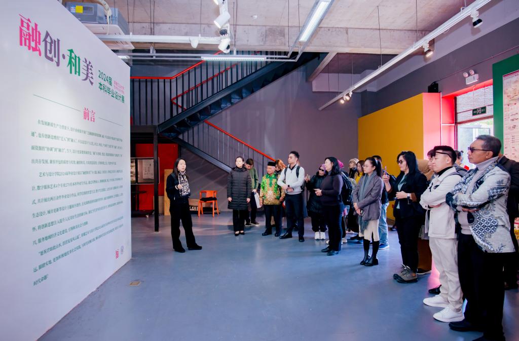 代表团一行还参观了我校艺术与设计学院2024届本科生毕业设计展。艺术与设计学院邓婷老师针对展览作品的设计理念向来宾作详细介绍。我校学生设计制作的形式多样、创意独特、兼具美观与实用价值的艺术作品获得了代表团成员的一致赞赏。参观结束后,双方代表互赠礼物与祝福。