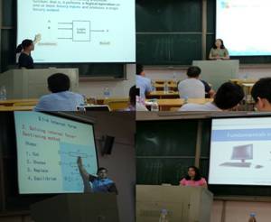 随后,本学期国际学生新任课教师代表进行了课堂教学展示。电气与信息工程学院的王彦老师、商学院的徐浩越老师、建筑工程学院的孔正义老师以及计算机科学与技术学院的吴玉喜老师先后对所授课程《数字电子技术》、《国际经济学》、《材料力学》及《计算机基础》做授课展示。各位老师娴熟的英语、精心准备的课件、饱满的教学热情获得参会人员的一直认可,现场气氛热烈。国际教学学院副院长胡善贵对各位老师的教学展示进行简要点评。