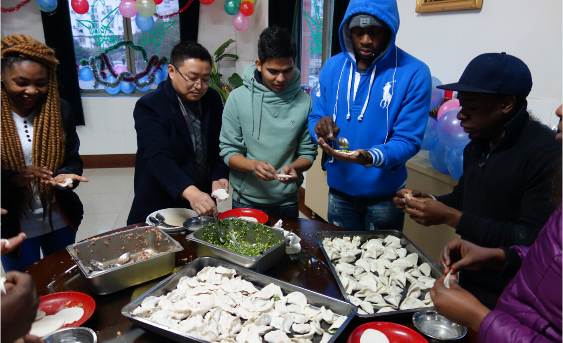 茶话会在我校秀山校区穆斯林餐厅举办,会场气氛热烈,洋溢着新春的吉祥。茶话会有国际教育学院副院长胡善贵主持,院长戴俊霞致辞:祝福留学生和教师新春快乐,新的一年有新的进步和收获。任课教师代表曹瑞斓对留学生表达了教师们的祝贺;来自赞比亚留学生Michael代表留学生对学校和教师的工作表示感谢,也表示一定会好好学习专业知识和学习中国的文化。在后勤集团的协助下,也为了让留学生体验中国文化,教师们带领留学生包饺子,大家兴高采烈,短短一个小时近十斤的饺子包了出来。
