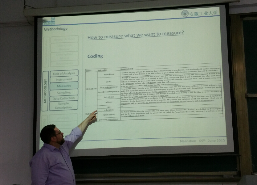 6月9日下午,英国考文垂大学商学、环境和社会科学学院副教授Luca Cacciolatti博士应邀来我校,为国际贸易专业硕士班留学生作了题为“研究设计”(Research Design)的学术报告。