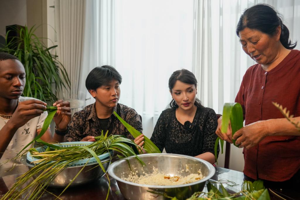 在护河镇龙舟训练基地,留学生身着救生衣登上龙舟,在专业队员指导下掌握划桨节奏,在铿锵的鼓点中完成首次竞渡体验,感受团结协作的龙舟精神。田野间,留学生亲手采摘翠绿粽叶,从折叶、填米到捆扎,一步步向村民学习裹粽技艺,在艾草清香中聆听屈原的故事,感受文化传承。
