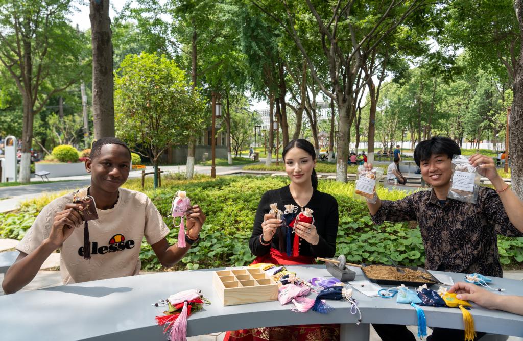 在真趣园,留学生在中医师的指导下,研磨丁香、艾叶等药材,亲手制作端午香囊,感受传统中医智慧与节日习俗的融合。留学生佩戴上五彩绳,体悟古人寄托在传统习俗中对健康与平安的祝愿。