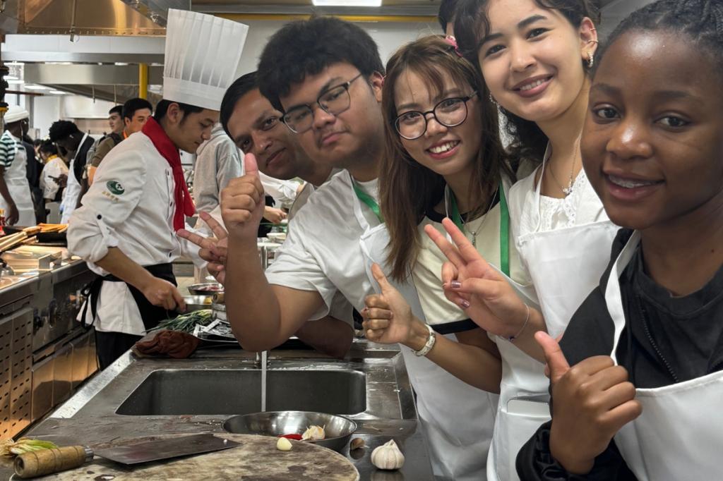 在徽菜制作体验环节,留学生在烹饪名师对徽菜特色的讲解和现场指导下,学习烹饪臭鳜鱼。从精细改刀到文火慢煨,留学生认真完成每一道工序,并品尝了自己亲手制作的臭鳜鱼。我校缅甸籍留学生李雪冰说:“在与同学们协作制作臭鳜鱼的过程中,我深切感受到徽菜烹饪的独特魅力。 臭鳜鱼独特的发酵风味,藏着安徽人应对季节、保存食材的生活哲学,也藏着人与自然对话的智慧。这是一次非常难忘的经历。”